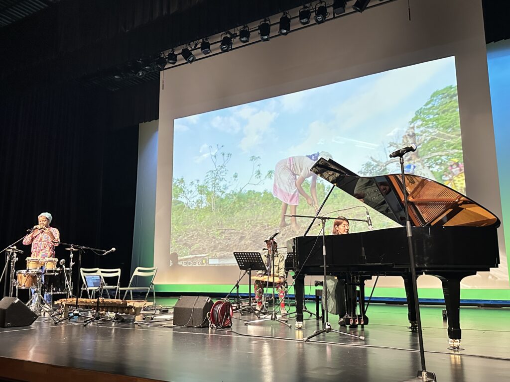 椎野若菜さんが趣旨説明をした後、マチュメさんがショピ民族の伝統曲をティンビラで演奏し、その後は、3人のセッションに移った。後半のセッションのほとんどが、沖縄の民謡とモザンビークの音楽を掛け合わせたものである。マチュメさんと亜弥さんはいつも場に対して心が開かれており、互いに会話をするように自由に歌を掛け合うことができる。私の役目は、沖縄とモザンビークの歌がお互いに響き合いそうな歌やリズムパターンを探して演奏することだった。